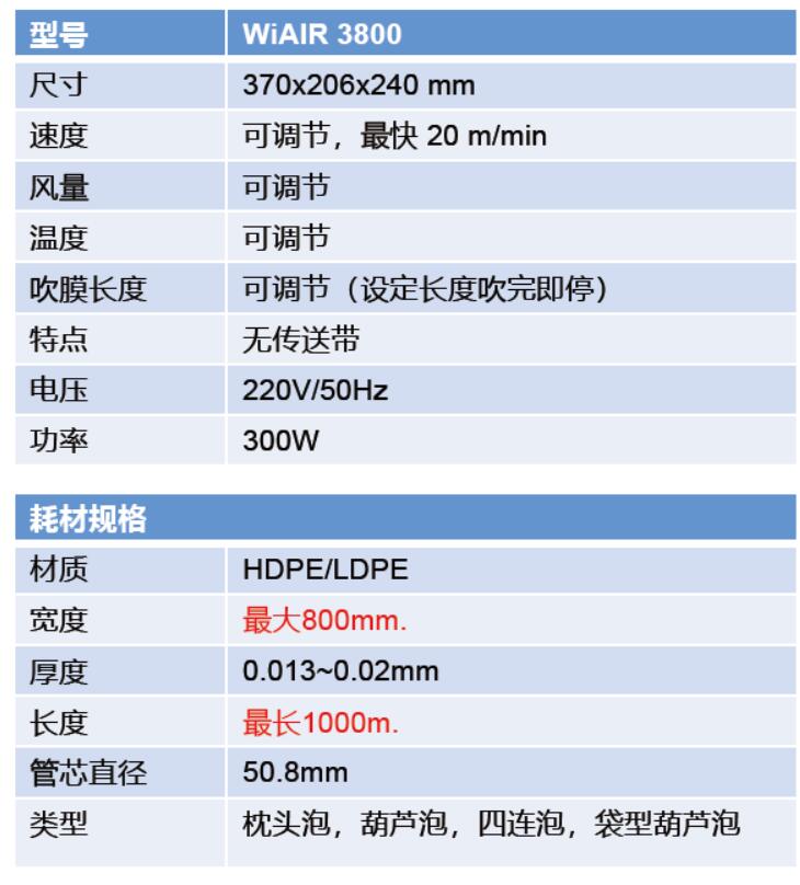 WiAIR 3800 可以吹枕頭泡,葫蘆泡,四連泡和袋型葫蘆泡;可以用于各種需要填充空間或者包裹物品的情景使用,例如:醫(yī)療用品,化妝品,數(shù)碼電子產(chǎn)品,書本,食品類,箱包,易碎品等。