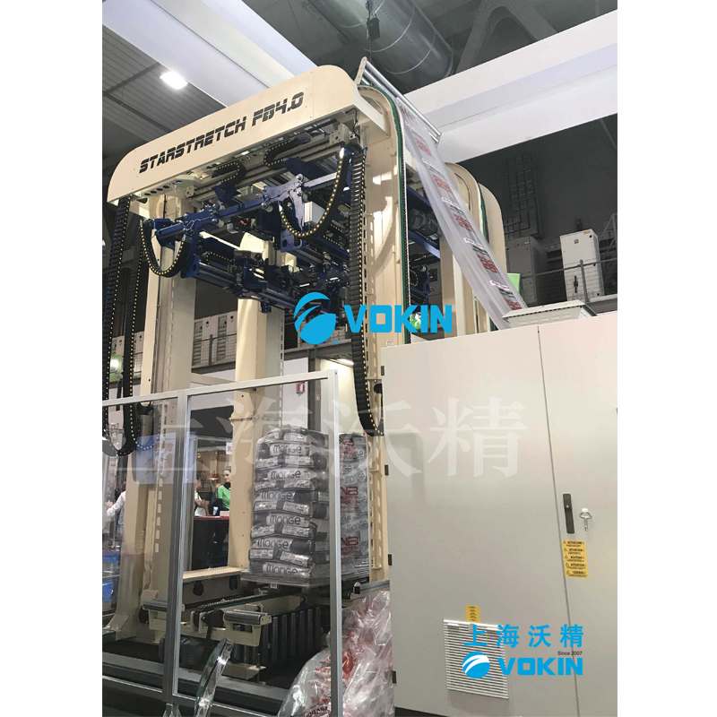 在特殊和狹小區域中,機器人碼垛后,可移動機器到碼垛工位后進行套膜包裝