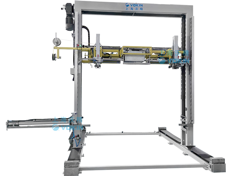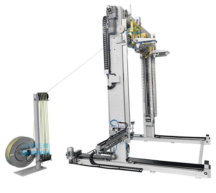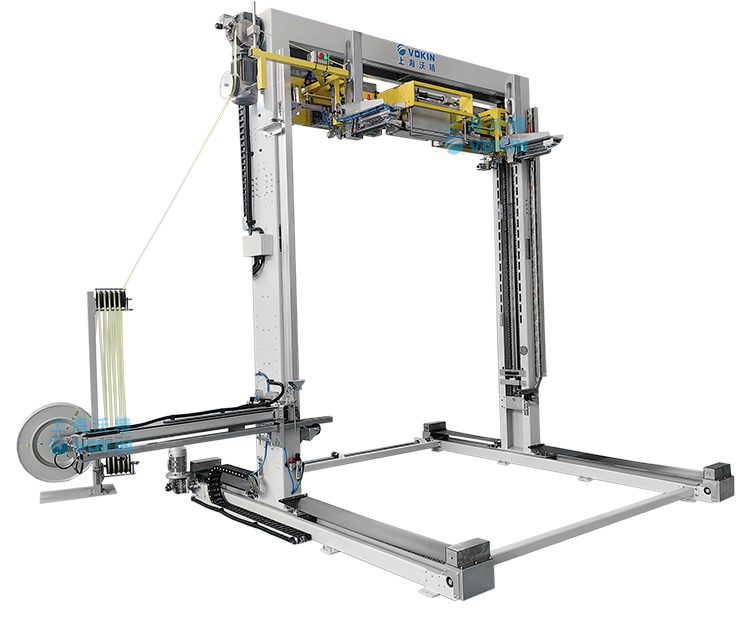 移動式打帶機可以自動尋找打帶位置并且配合打帶機底部的旋轉臺輸送機,可以完成井字型打帶,并且可短護角保護產品不被打包帶損傷。