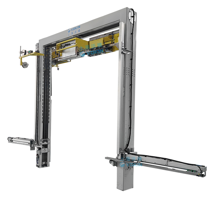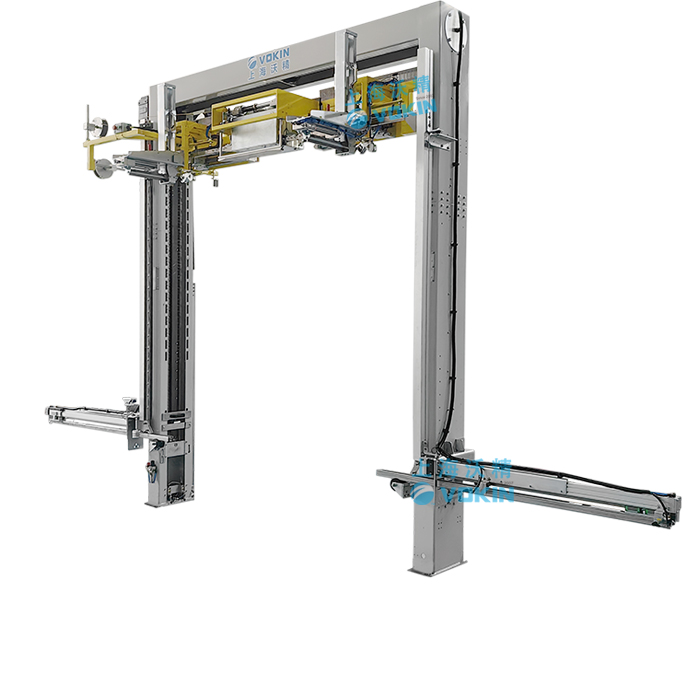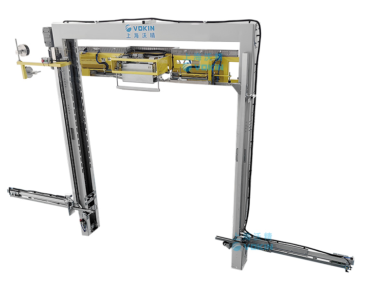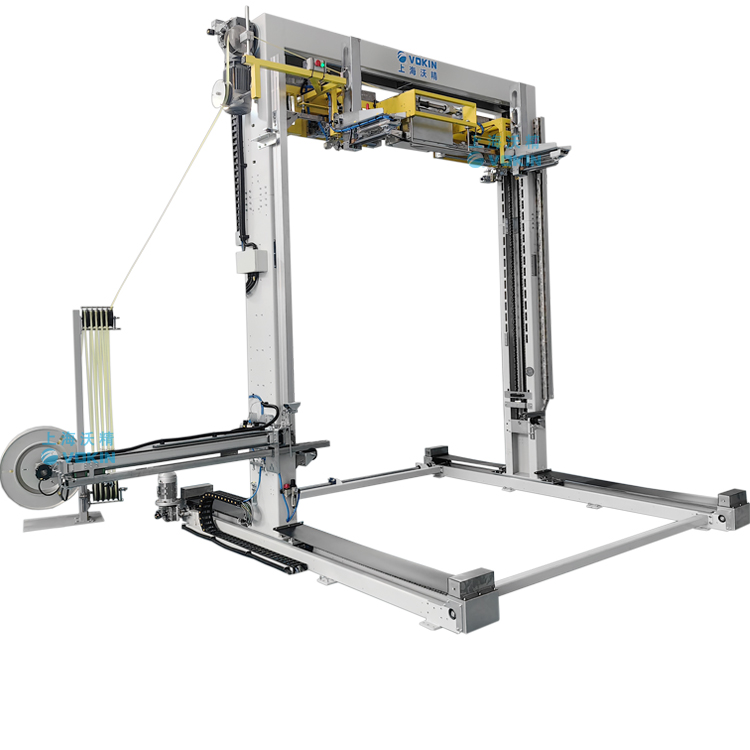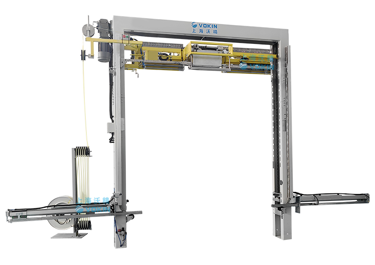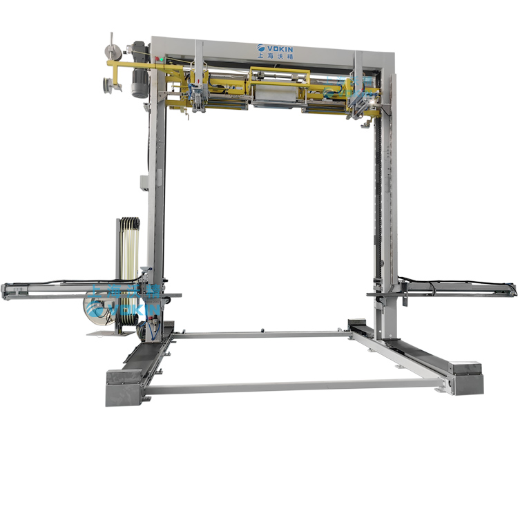 移動式打帶機(jī)可以自動尋找打帶位置并且配合打帶機(jī)底部的旋轉(zhuǎn)臺輸送機(jī),可以完成井字型打帶。