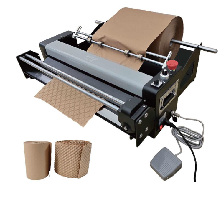 此款機器可制作寬幅500mm的壓泡紙,機器可自由調速,配置腳踏開關,可自由控制出紙長度,適合小型倉庫,生產線等場所