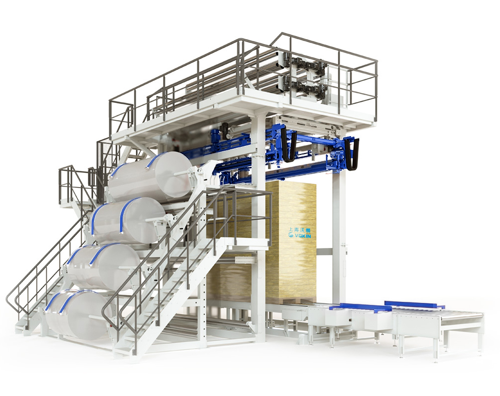 套袋過程過程中還包括一個外形輪廓控制系統(tǒng),它根據(jù)跺型的實際尺寸自動調(diào)整薄膜位置,保持薄膜拉伸力的平衡。